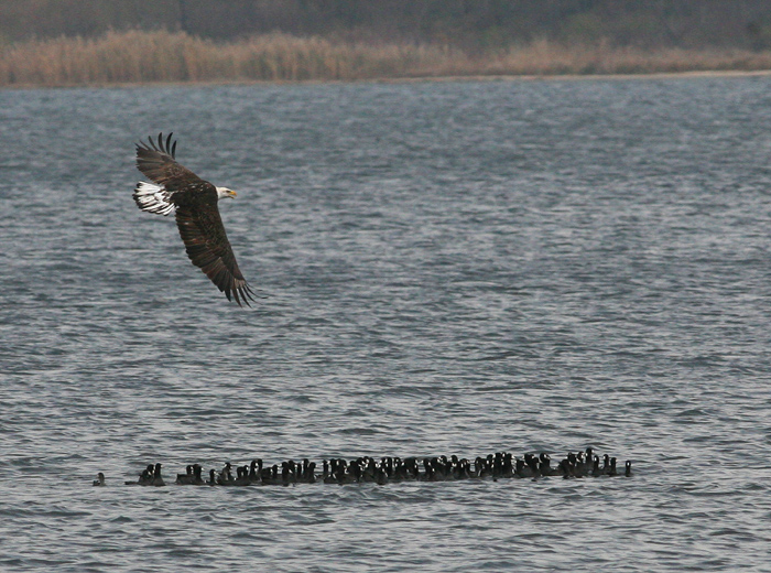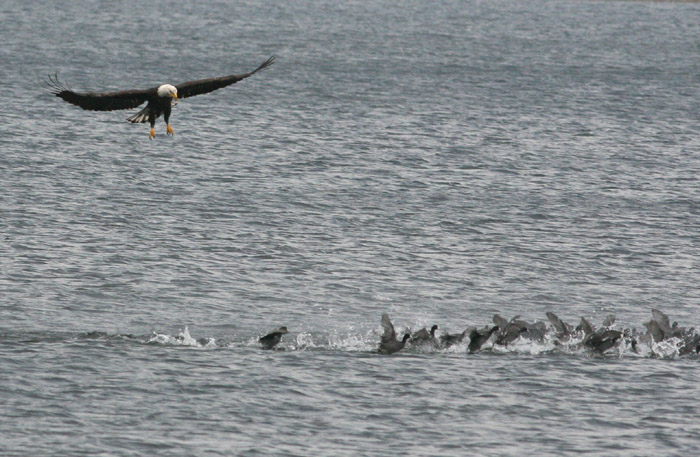 There was safety in numbers this time. The tightly packed flock confounded the Eagle. It finally left, followed closely by a Seagull.