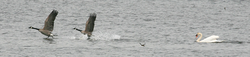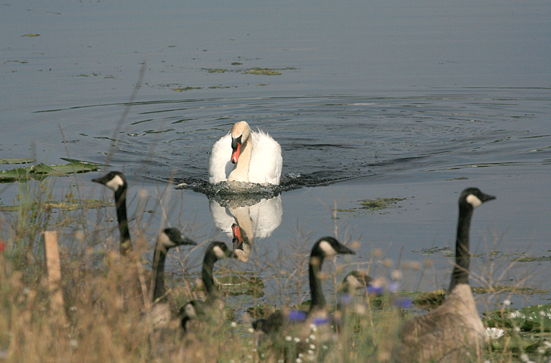 young Canada Geese. The large Mute chased the panicked geese onto shore. This aggressive behavior was
