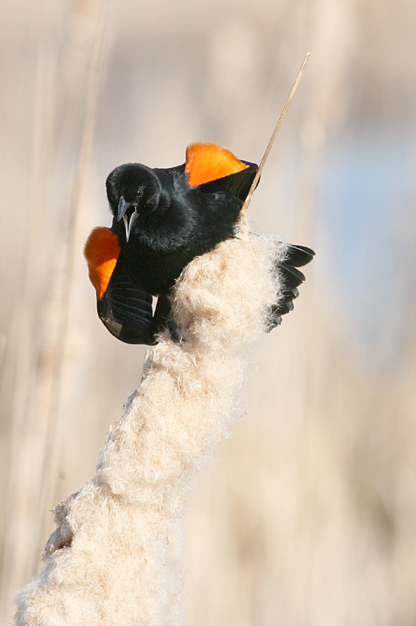 Perched on Phragmites invasive grass species. (pronounced "frag mite• ees)